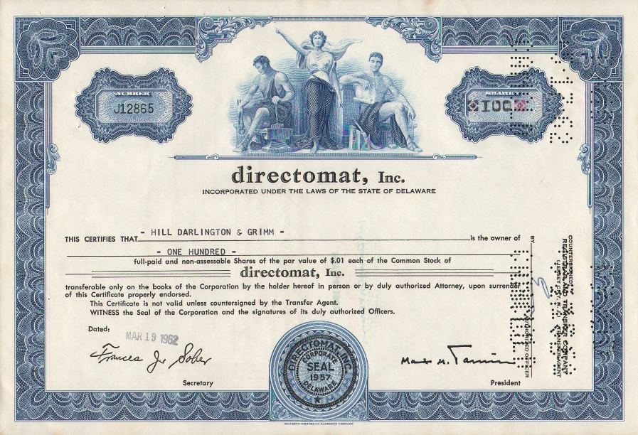 בארה"ב כאשר מדברים על מניות באופן כללי הן נקראות Stocks, כמו Stock market או Energy stocks. וכאשר מדברים על מניות של חברה ספציפית הן נקראות Shares, כמו לדוגמה Apple shares. בתמונה ניתן לראות שטר ישן משנות השישים שהקנה 100 מניות דירקטומט למחזיק בו.